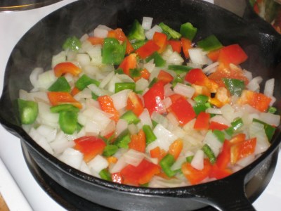 1. In a cast iron skillet warm 1tbsp of oil on medium high heat. Add onions and peppers and some fresh ground salt and pepper. Saute for 4-5 minutes.