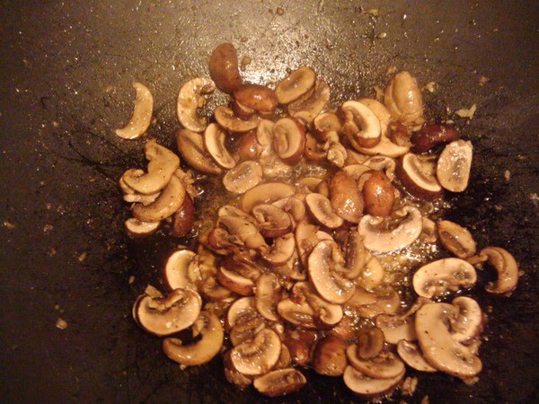 3) Add mushrooms, stirring constantly until cooked down more than halfway.
